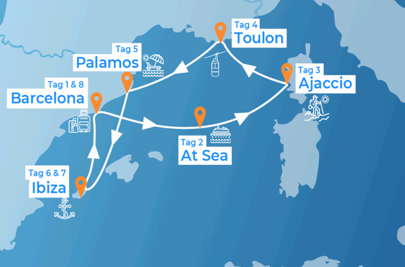 - Kreuzfahrt-Route: Barcelona (Spanien) – Ajaccio (Italien) – Toulon (Frankreich) – Palamos (Spanien) – Ibiza (Spanien) – Barcelona (Spanien)